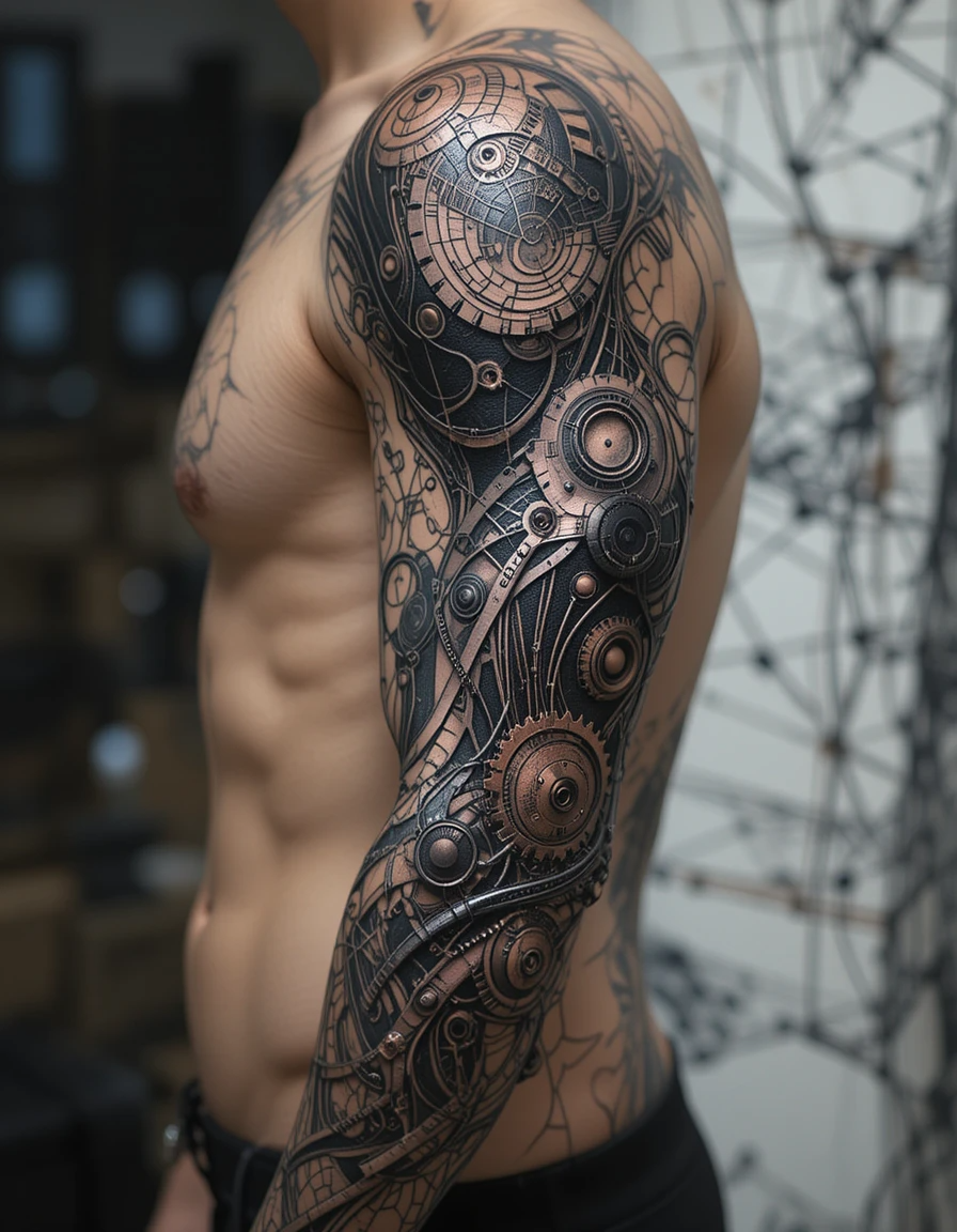 Steampunk Influences: The steampunk aesthetic has influenced biomechanical tattooing, introducing Victorian-era mechanical elements and brass-toned color schemes.