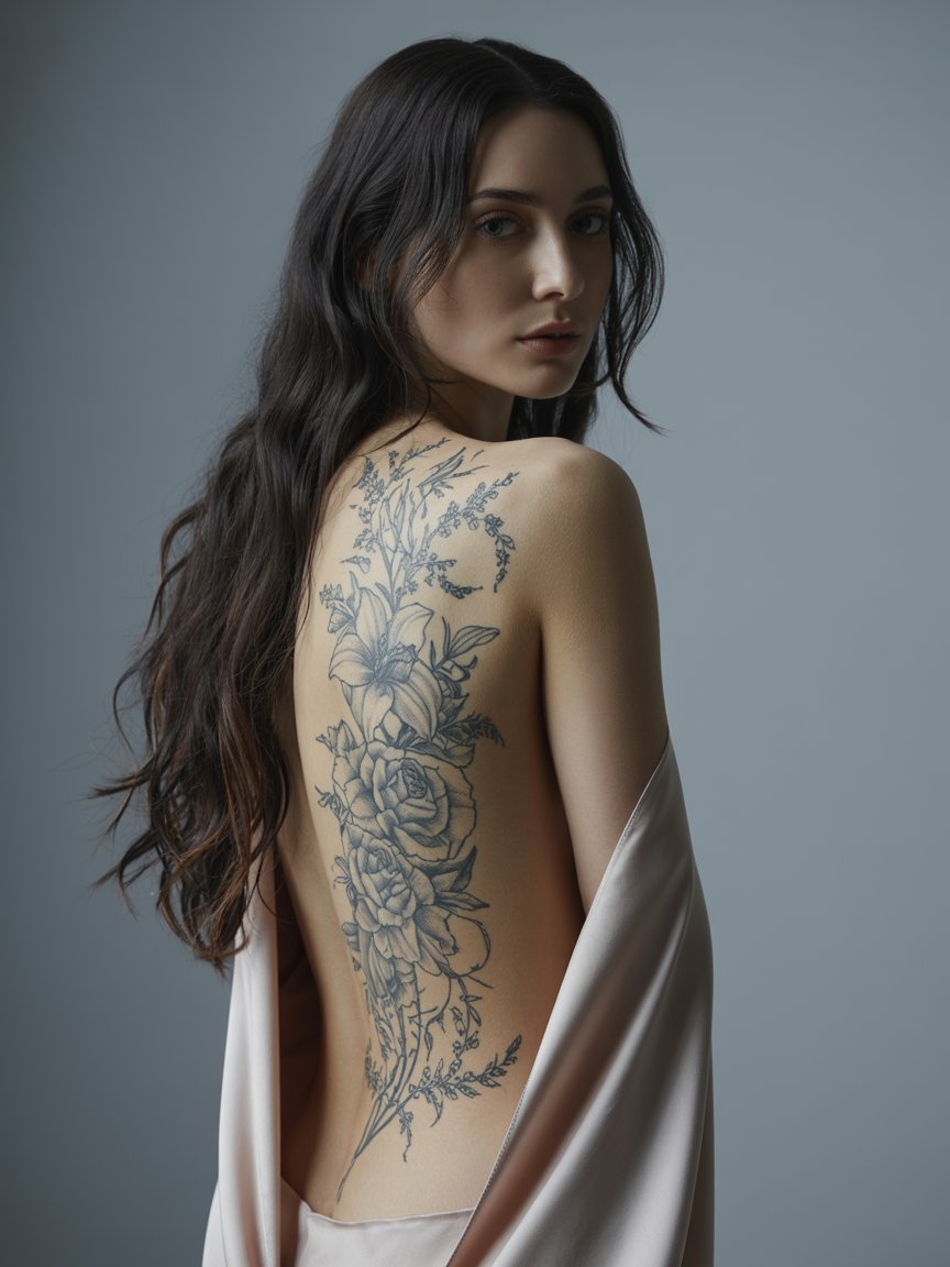 The sophisticated beauty and symbolic complexity of floral spine tattoos require specialized expertise in botanical illustration and understanding of feminine aesthetic principles.