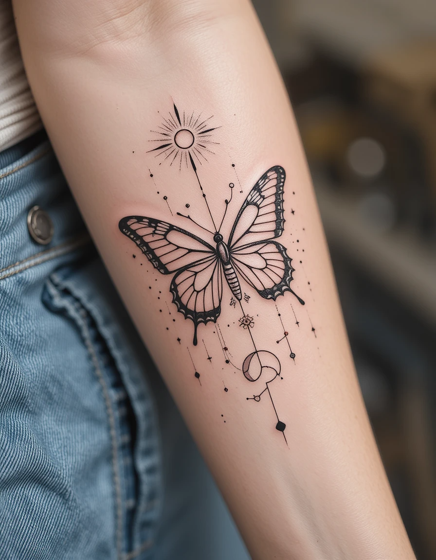 Smaller celestial butterfly tattoos work beautifully on the wrist or lower forearm, creating delicate, feminine pieces that can be easily shown or concealed as needed.