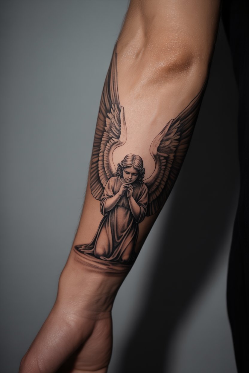 Guardian angel tattoos frequently mark significant spiritual journeys: